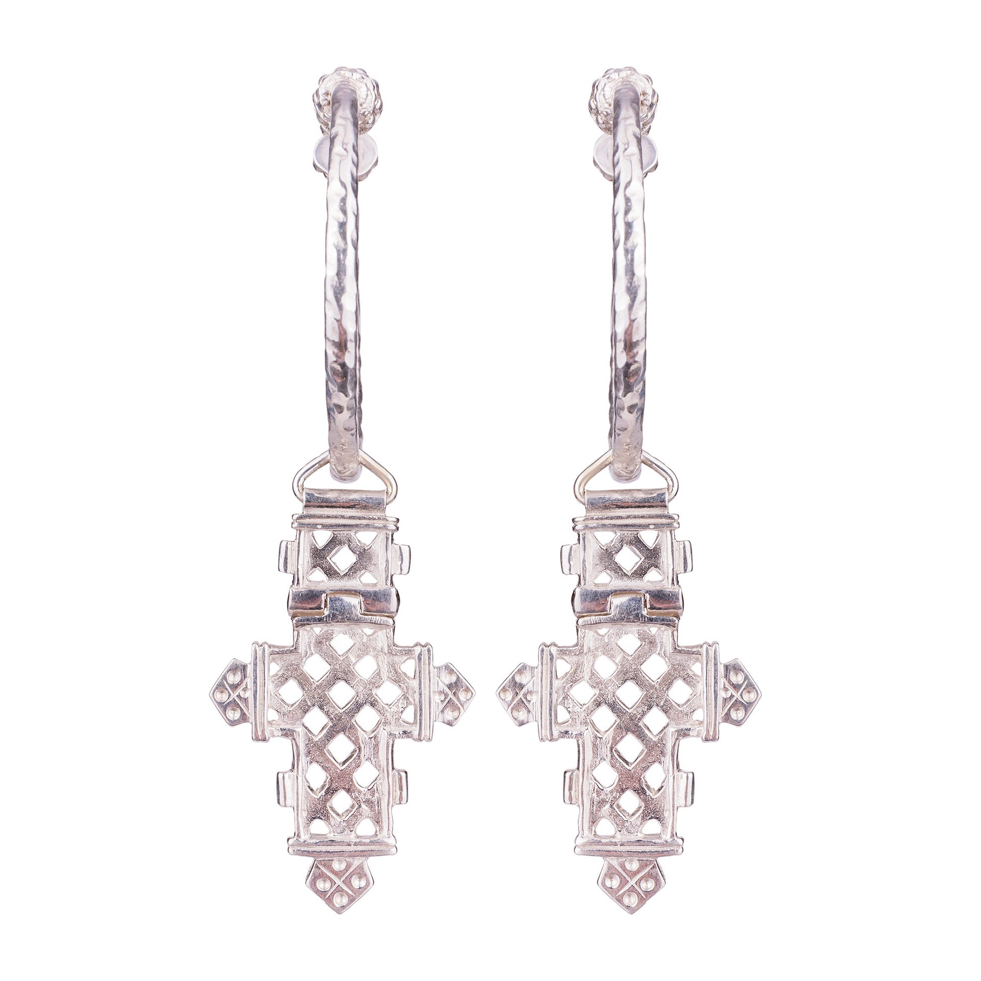 Inspired Coptic orthodox crosses hung from simple beaten hoops. These earrings are full of detail and make a real statement to a simple outfit.