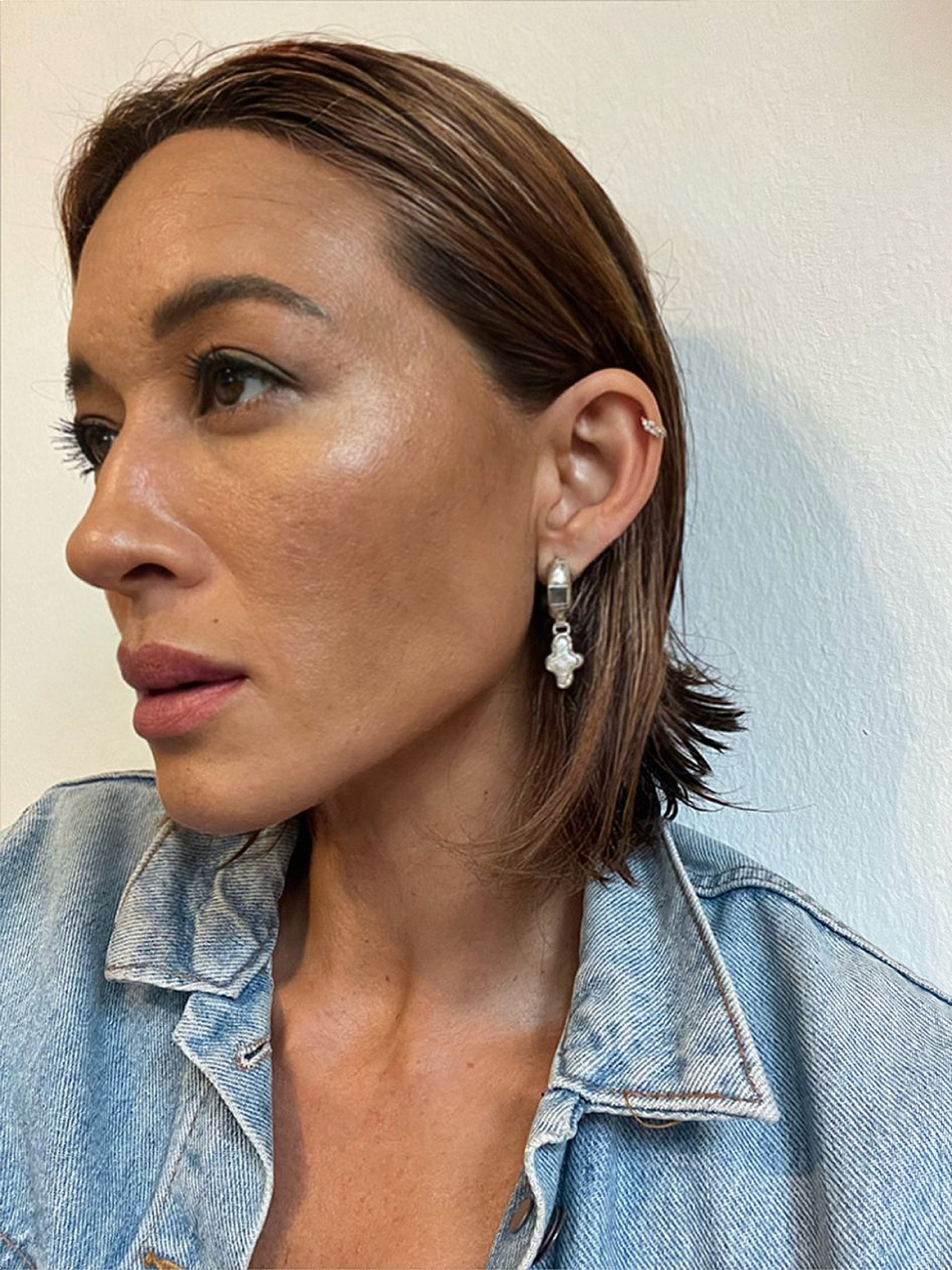 Hand tooled Huggies with beaten effect. Mounted square labradorite wth dangling cross shaped cultured pearl.
