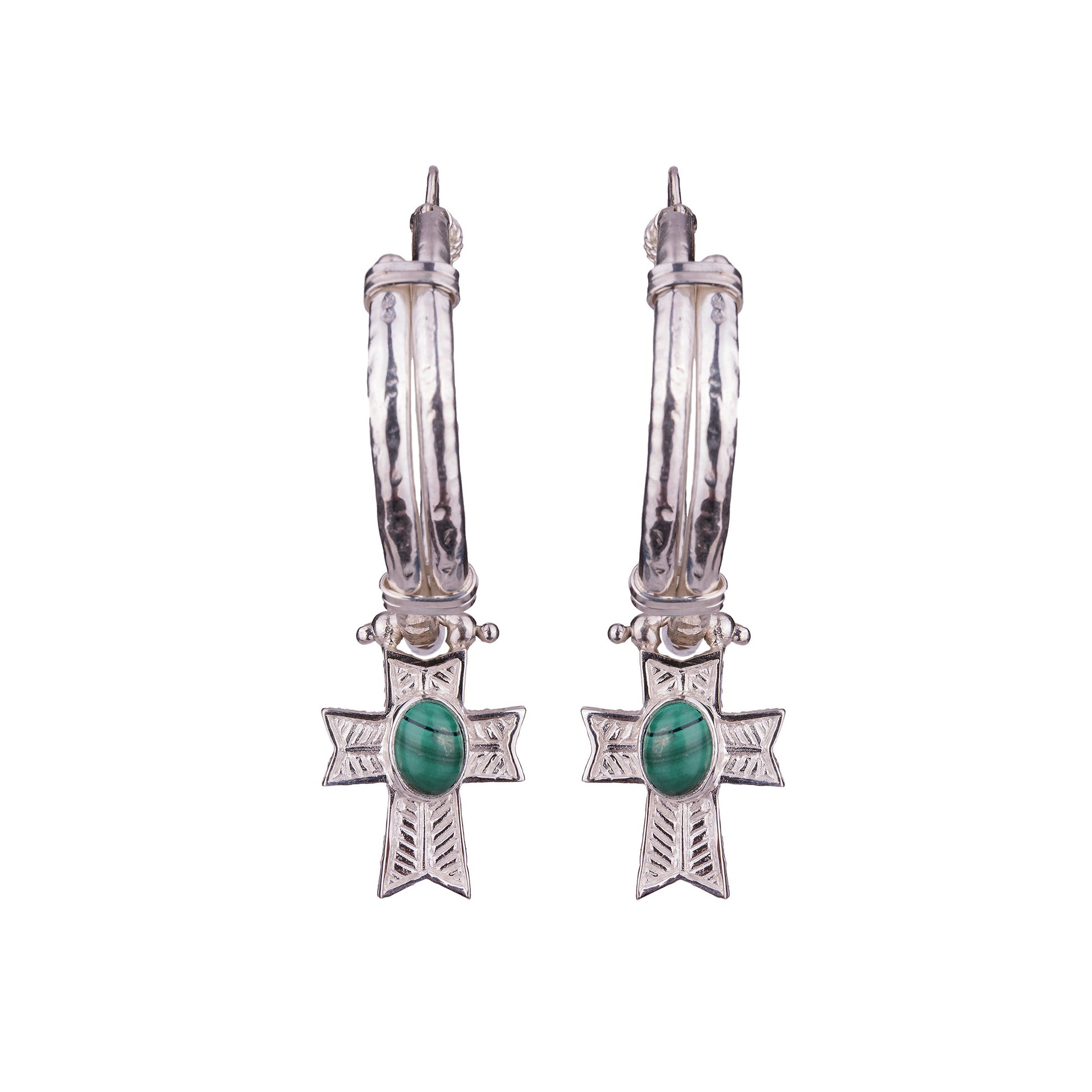 Hollow hoops with sliding roman inspired crosses. Lightly beaten hoops give a perfect antique look offset with detailed hollow crosses set with malachite cabochons.