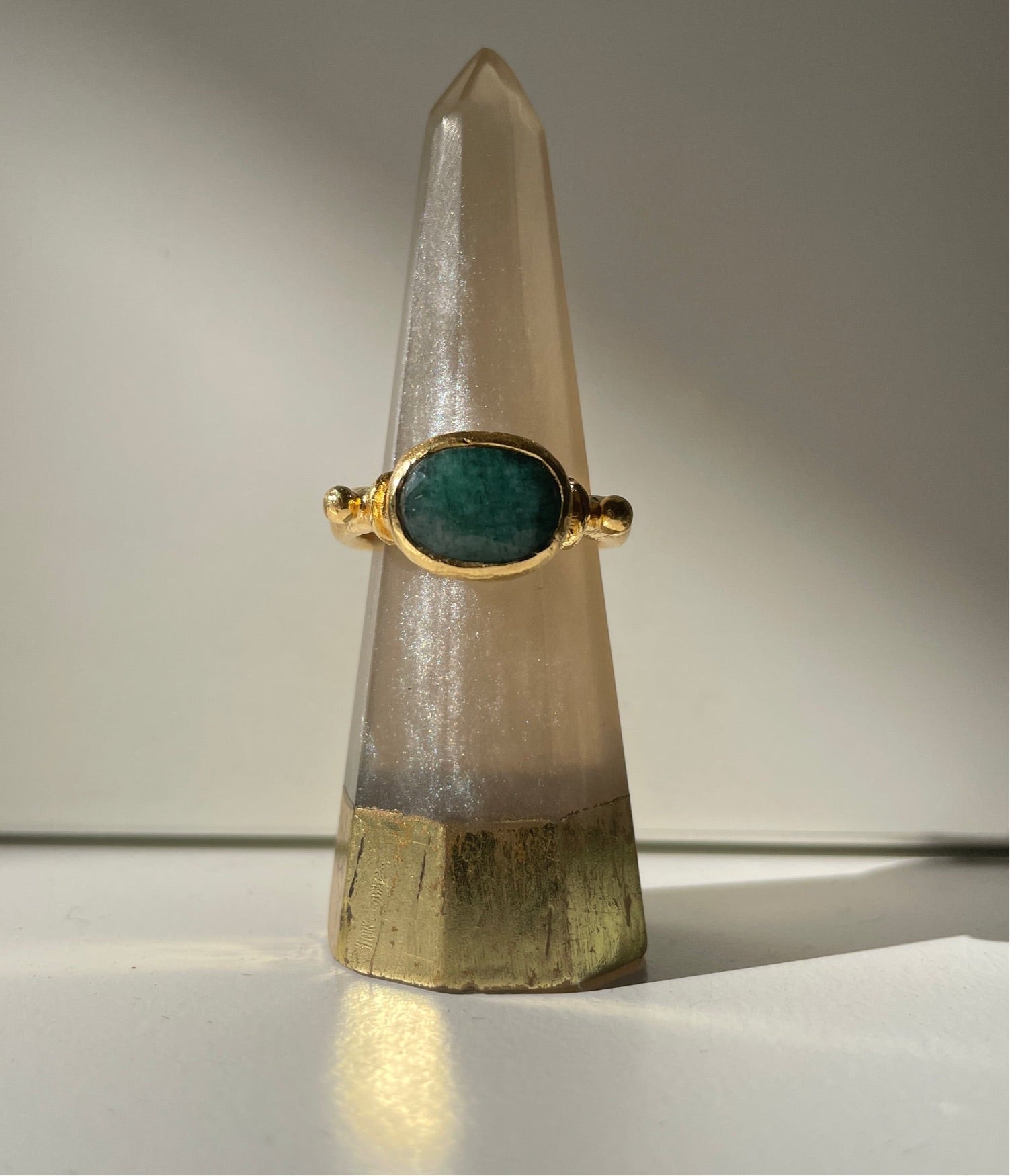 Stunning hand tooled Roman inspired ring featuring stunning oval cloudy Colombian Emerald …