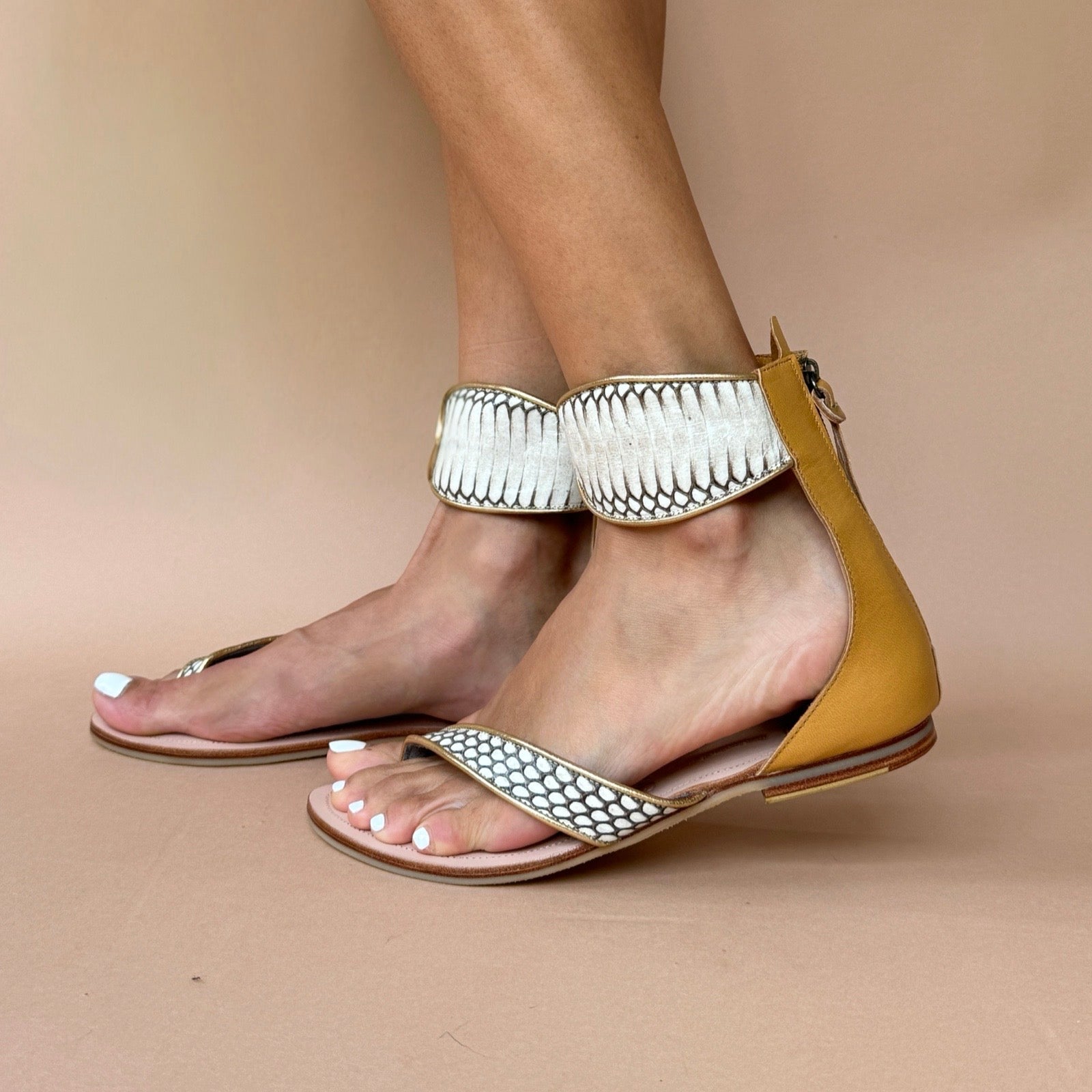 These flats feature a flattering ankle cuff, its v-shape front tappers and slims the ankle whilst visually elongating the leg. They also feature a 4-toe strap which allows the big toe to have freedom and hence relieving strain on the ball of the foot. Aside from practical design features........they just look super cool on the foot!!!
