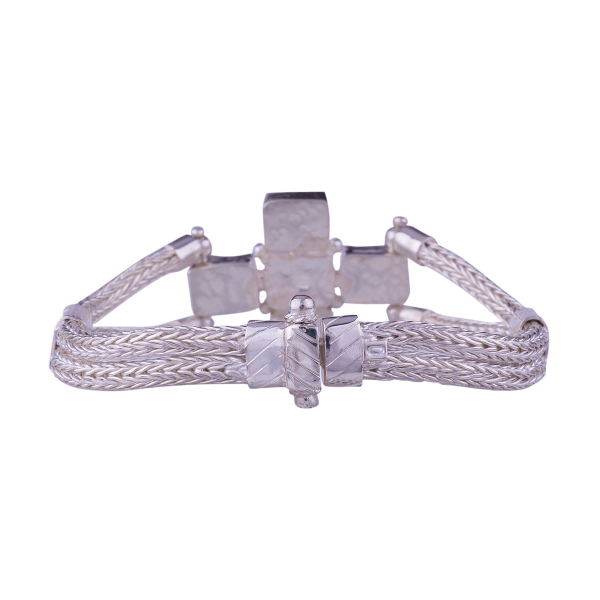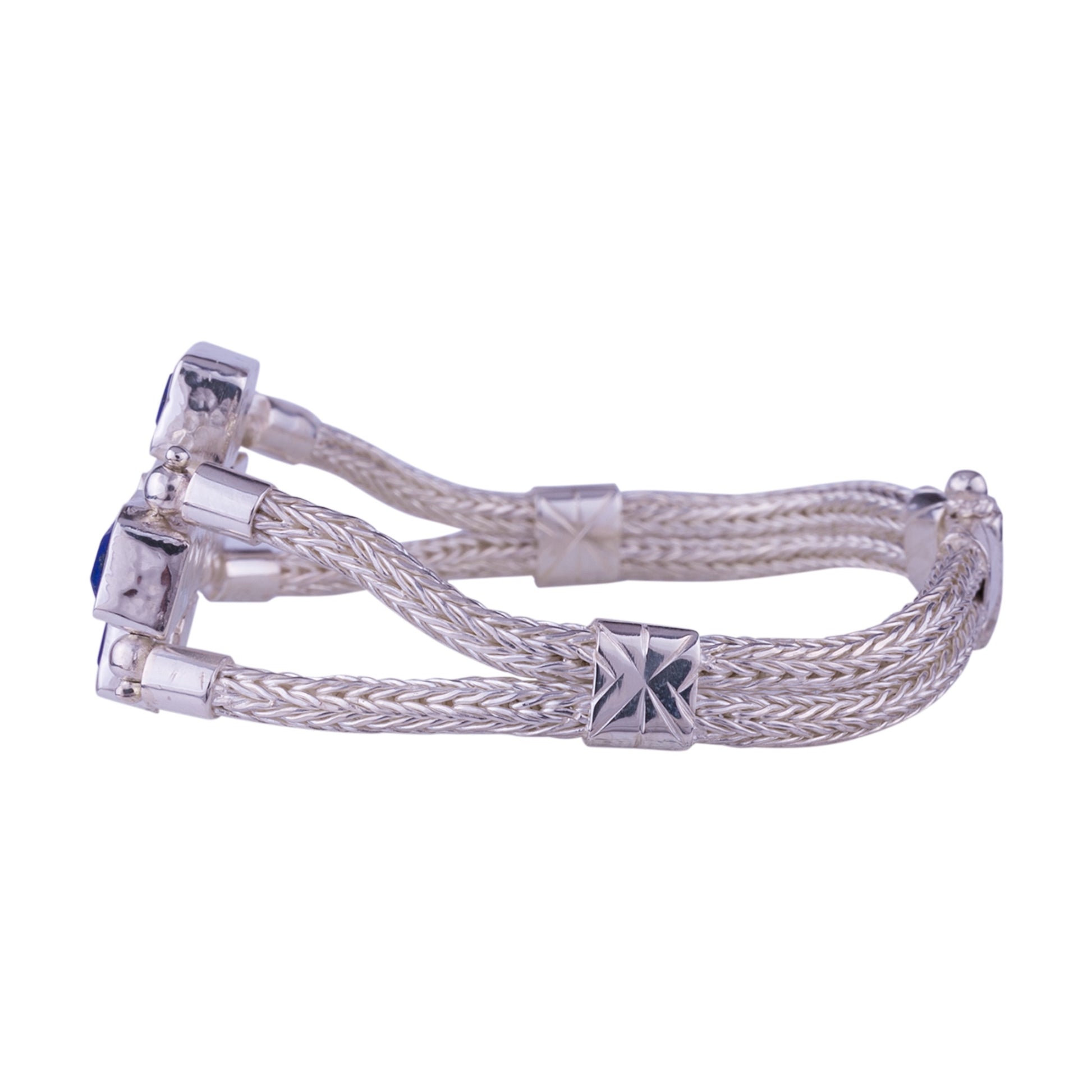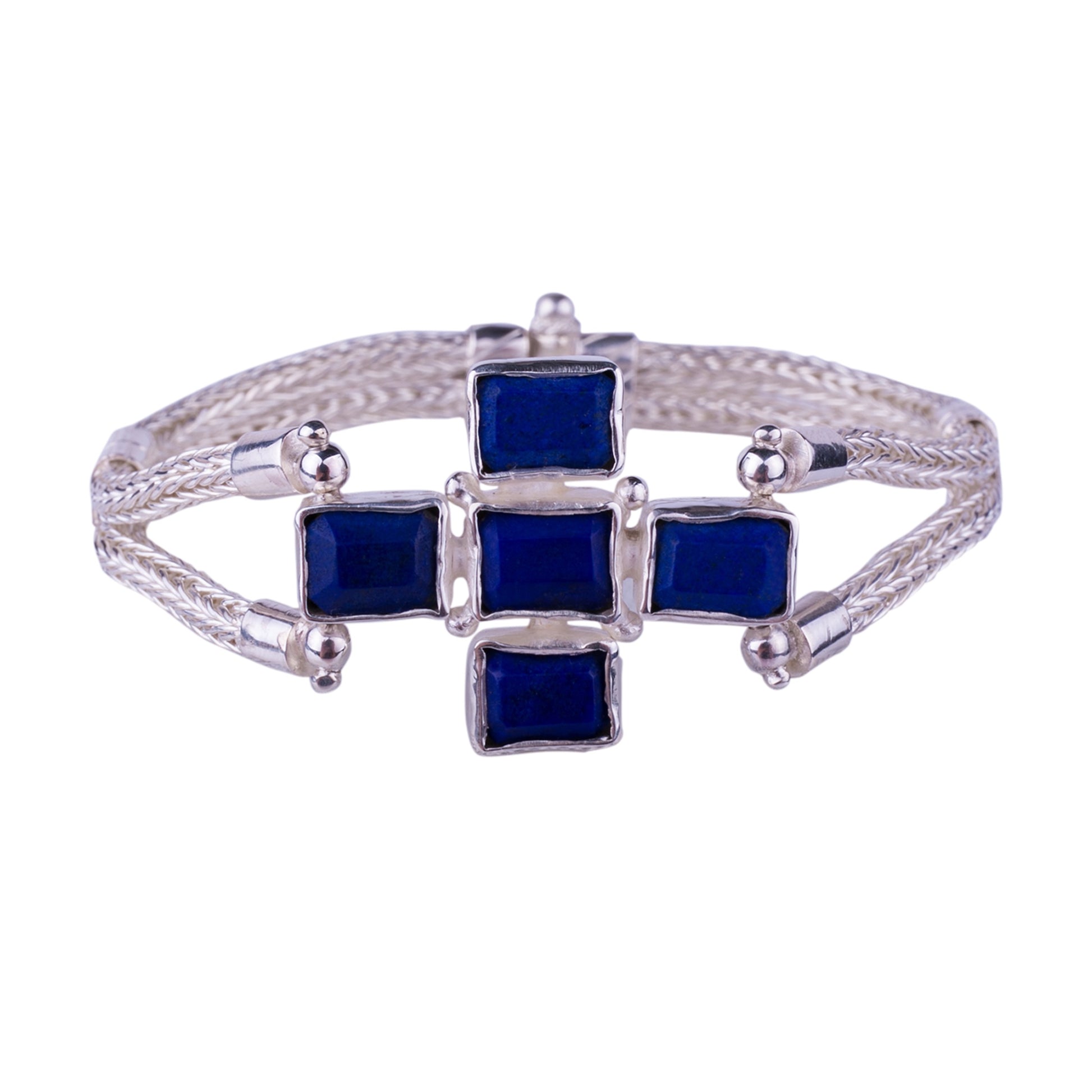 Royal blue Lapis stones with matt faceted finish create the center cross of this stunning bracelet. The cross is hinged on either side to contour the wrist and is teamed with heavy woven chain rope and fastened with pin and eye for secure closure.