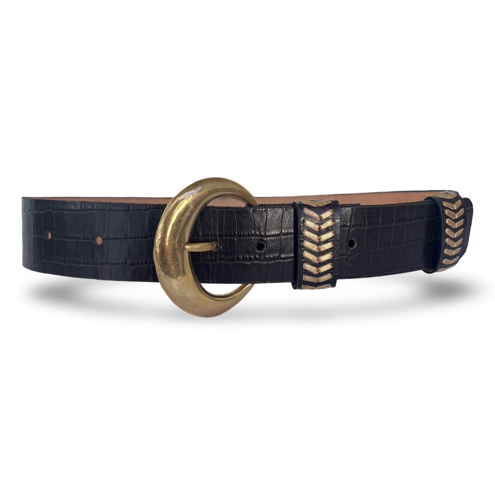 The buckles are handcart for real brass, the belt itself is cow leather with croc embossed effect.