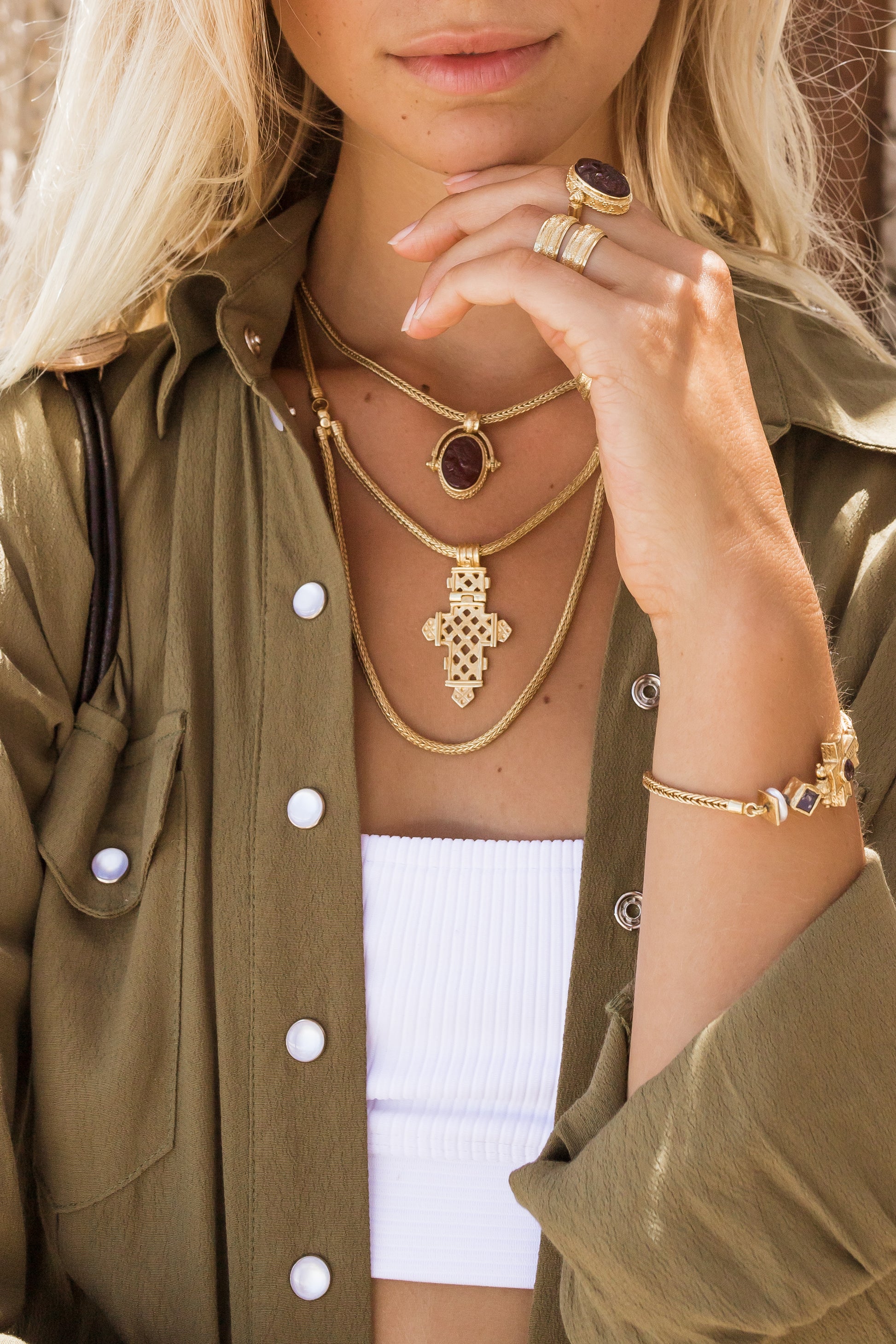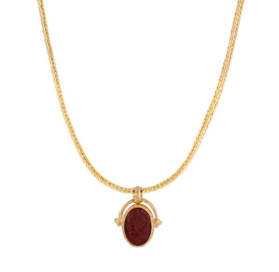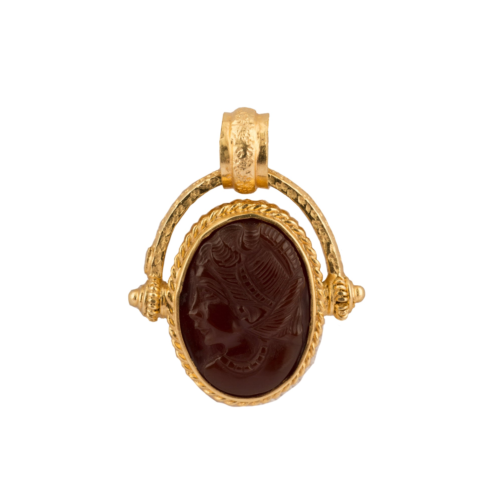 Carved out of Carnelian, each cameo is central to the pendant and features the portrait of a woman.