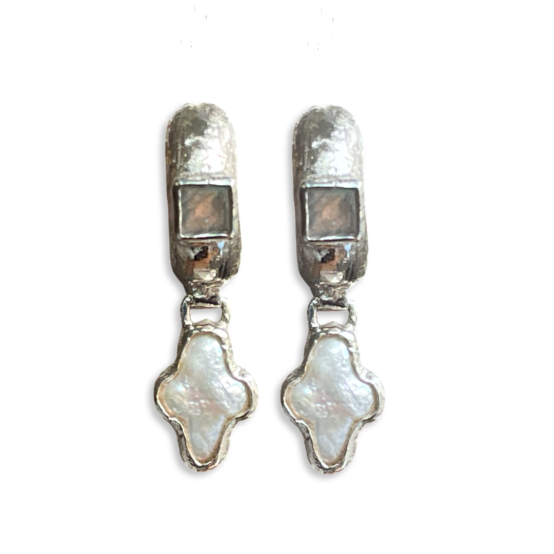 Hand tooled Huggies with beaten effect. Mounted square labradorite wth dangling cross shaped cultured pearl.