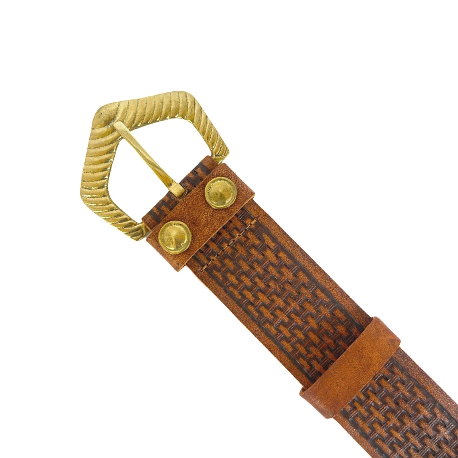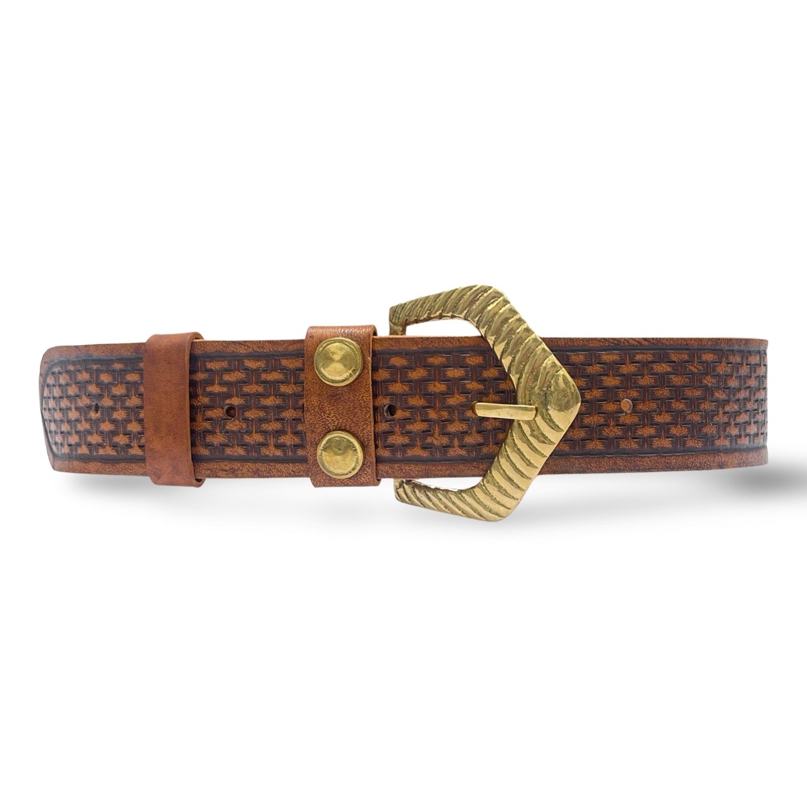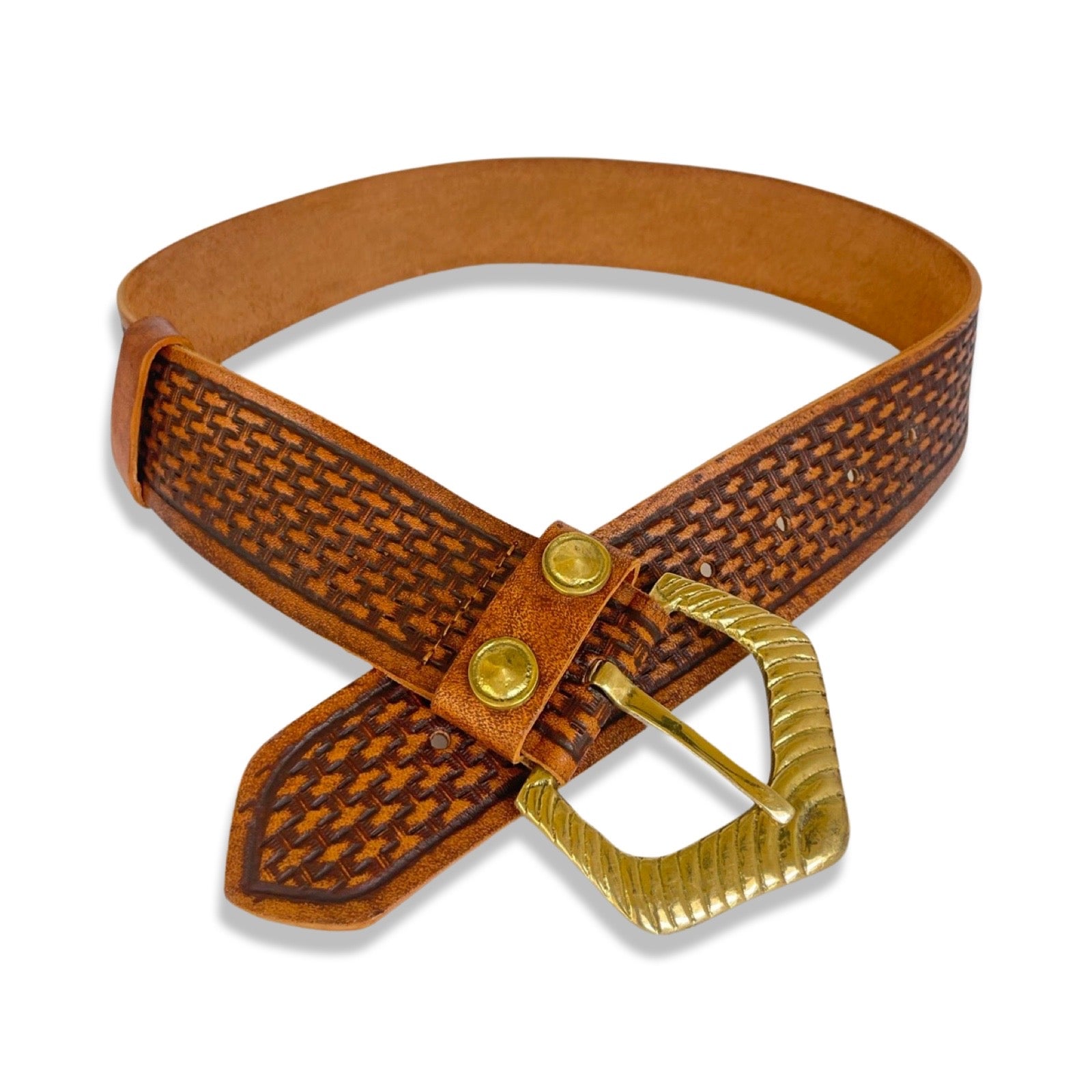 Hand tooled cow hide belt with basketry motif and pure brass hand cast buckle.