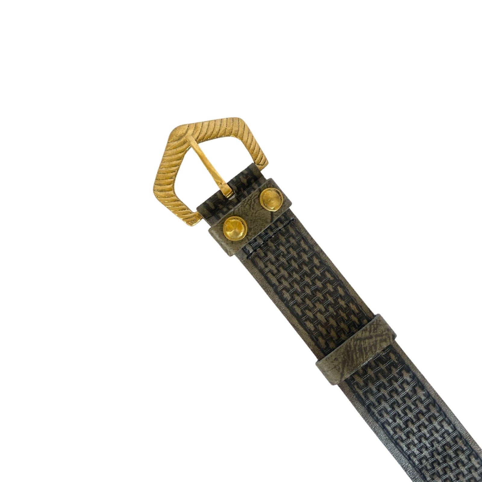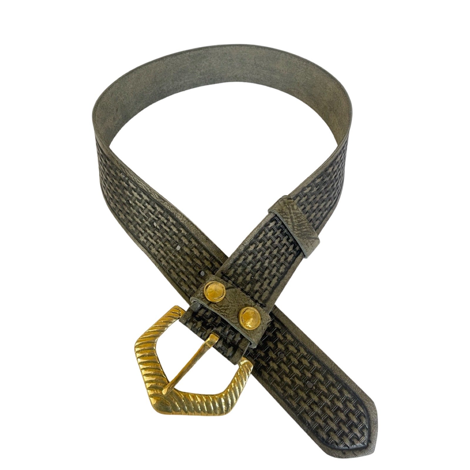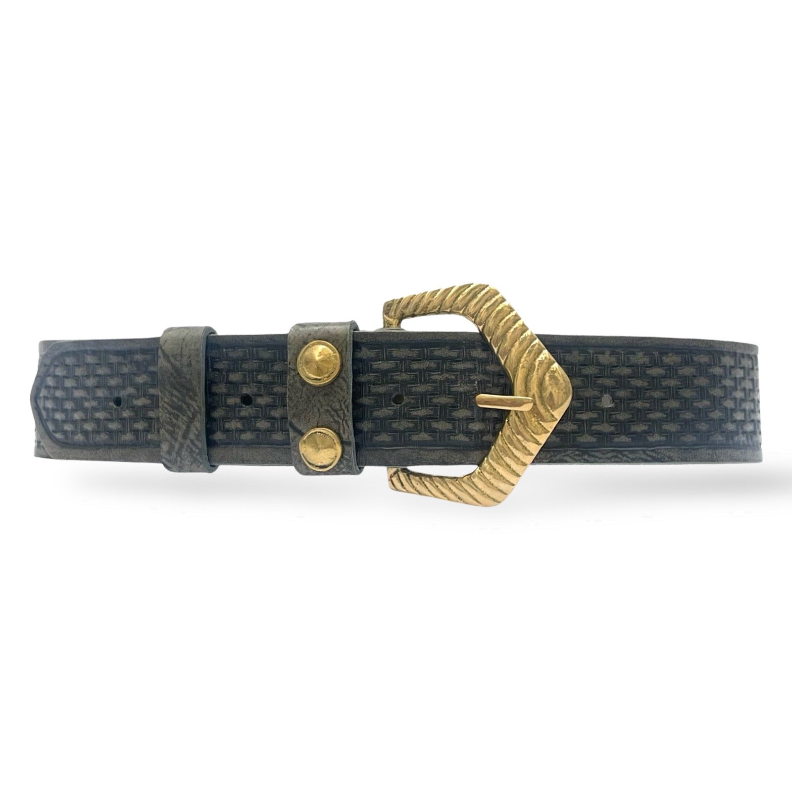 Hand tooled cow hide belt with basketry motif and pure brass hand cast buckle.